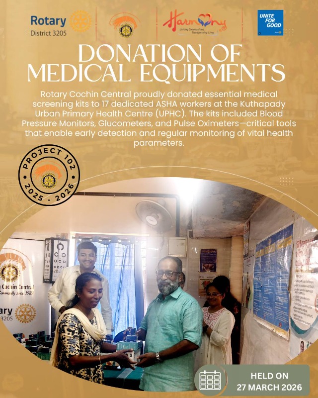 Rotary Cochin Central with great pride and joy have donated basic screening equipments like Blood Pressure Monitors, Glucometers & Pulse Oximeters to 27 ASHA workers attached with Thaluk Hospital, Fort Kochi & of UPHC Pandikudy on 28th November 2025 at 3.30 PM.